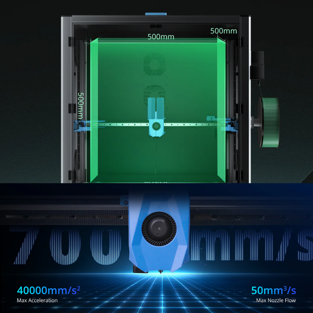 - Massive 500 x 500 x 500 mm Build Volume: Print large prototypes, functional parts, and full-scale models in one go wihtout splitting designs